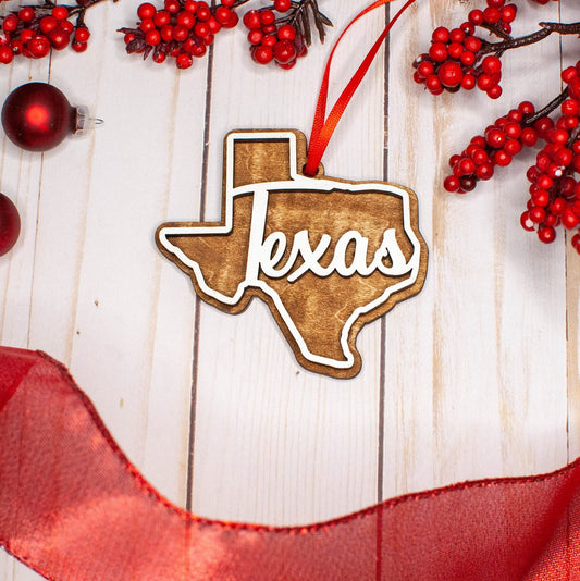 Texas Wildflower Christmas Ornament; bluebonnets, Indian paintbrushes, fire wheels, sunflowers, and coneflowers inside the state of Texas