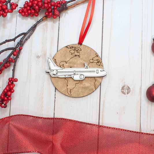Jet Airplane over World Christmas Ornament, Travel and vacation ornaments
