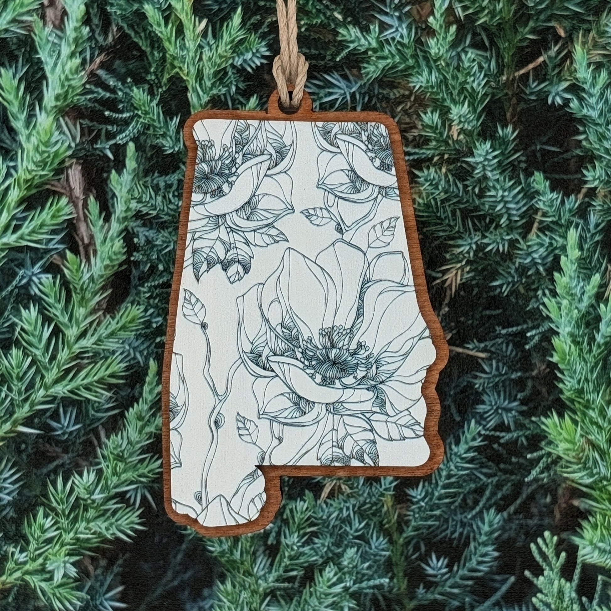 Celebrate timeless Southern elegance with this Alabama-shaped ornament featuring hand-drawn magnolia blossoms. The classic black and white line art design is both sophisticated and serene, honoring the state’s iconic flower.
