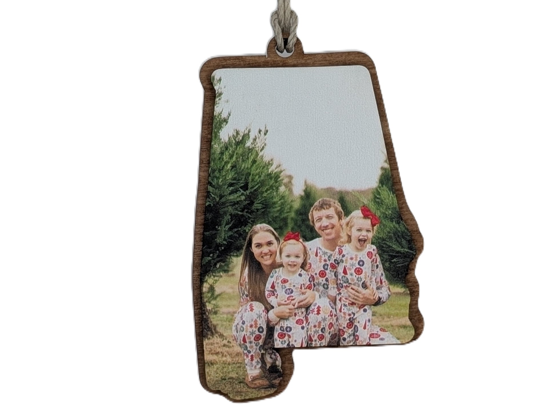 Show your love for Alabama with this beautifully crafted state-shaped ornament. Personalize it with your own photo for a meaningful touch. Please message me before purchasing to ensure your photo will fit properly.