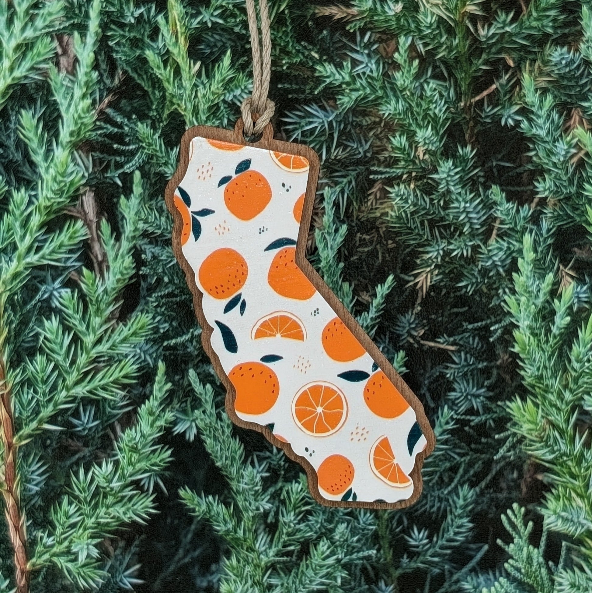 Celebrate California’s citrus heritage with this cheerful state-shaped ornament featuring bright, juicy oranges! Fresh and playful, it’s a sunny nod to California’s famous groves.
