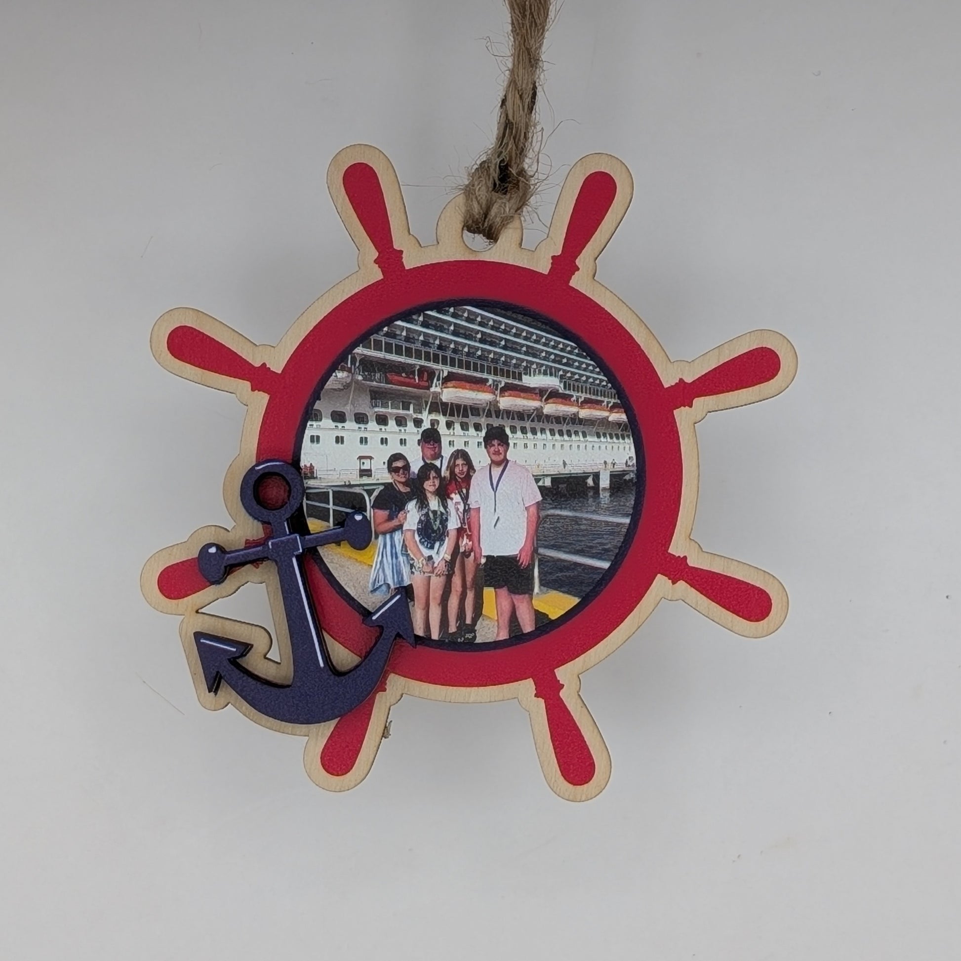 Commemorate your favorite voyage with this custom cruise ship ornament, designed to capture the joy and adventure of life at sea. Featuring a classic cruise wheel, this ornament becomes truly one-of-a-kind when personalized with your favorite travel photo.