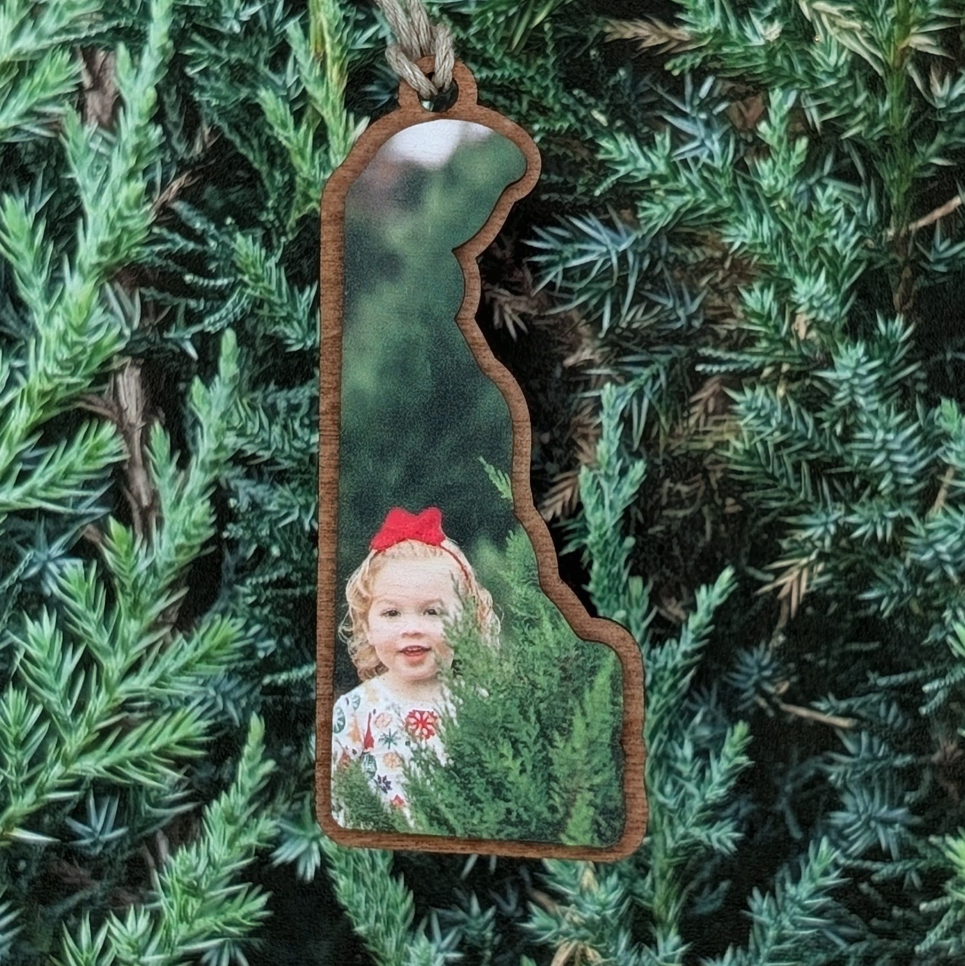 Show your love for Delaware with this beautifully crafted state-shaped ornament. Personalize it with your own photo for a meaningful touch. Please message me before purchasing to ensure your photo will fit properly.