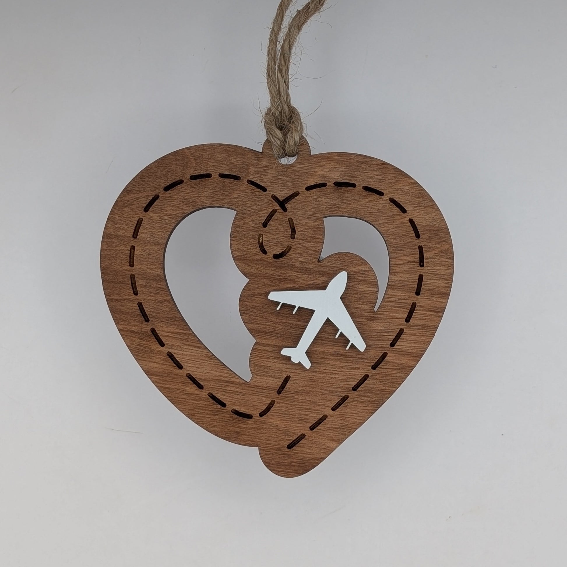Celebrate love across the miles with this beautifully crafted airplane ornament, featuring a heart-shaped design and a soaring white plane along a dotted path. Made from natural wood with clean, modern lines, it’s a sweet reminder that adventure and affection know no distance.