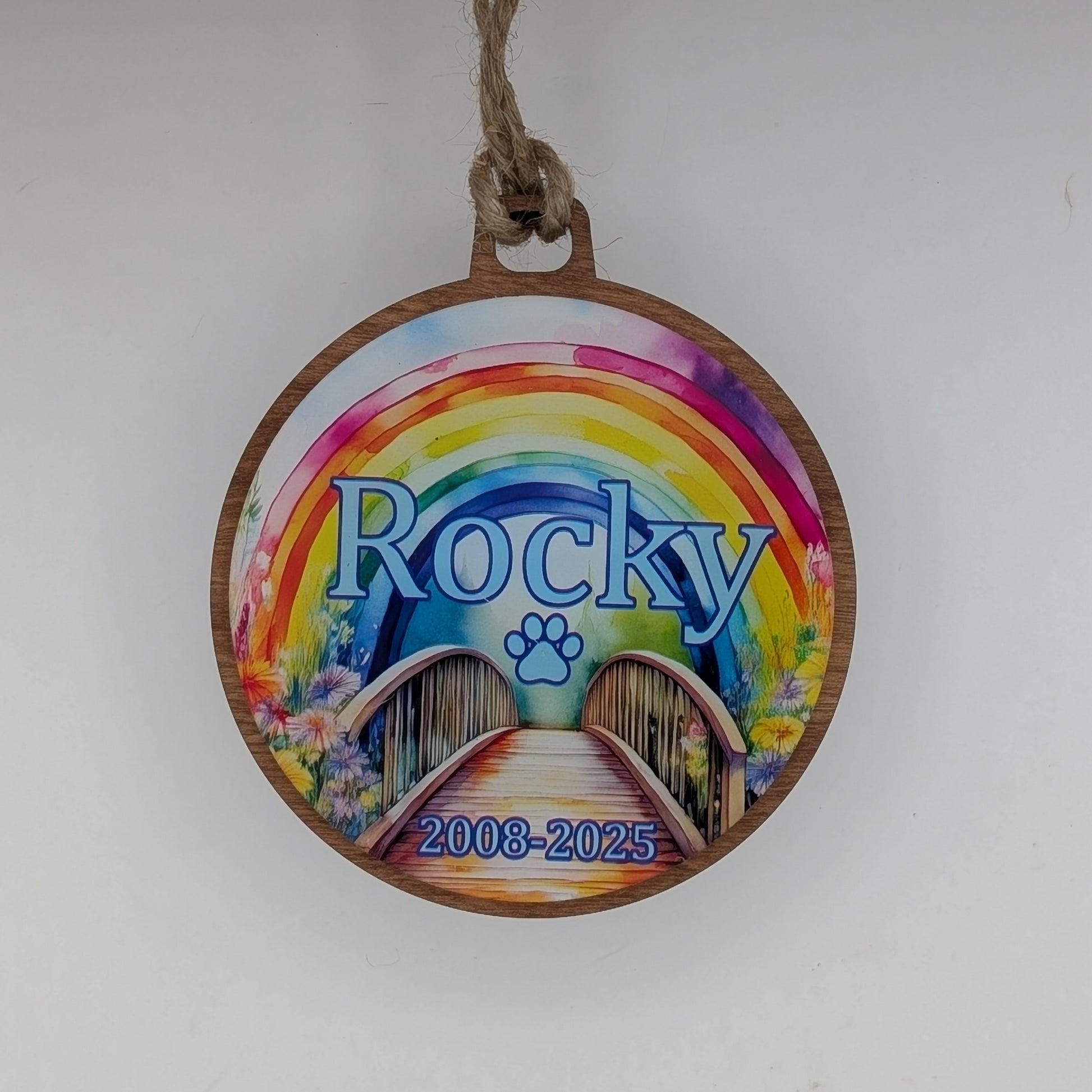 Keep their memory close with this beautifully crafted Rainbow Bridge ornament, featuring a vibrant rainbow, peaceful path, and personalized details to celebrate the life of a cherished pet. Colorful printed on natural wood, this ornament is a touching tribute to the love that lives on after goodbye.