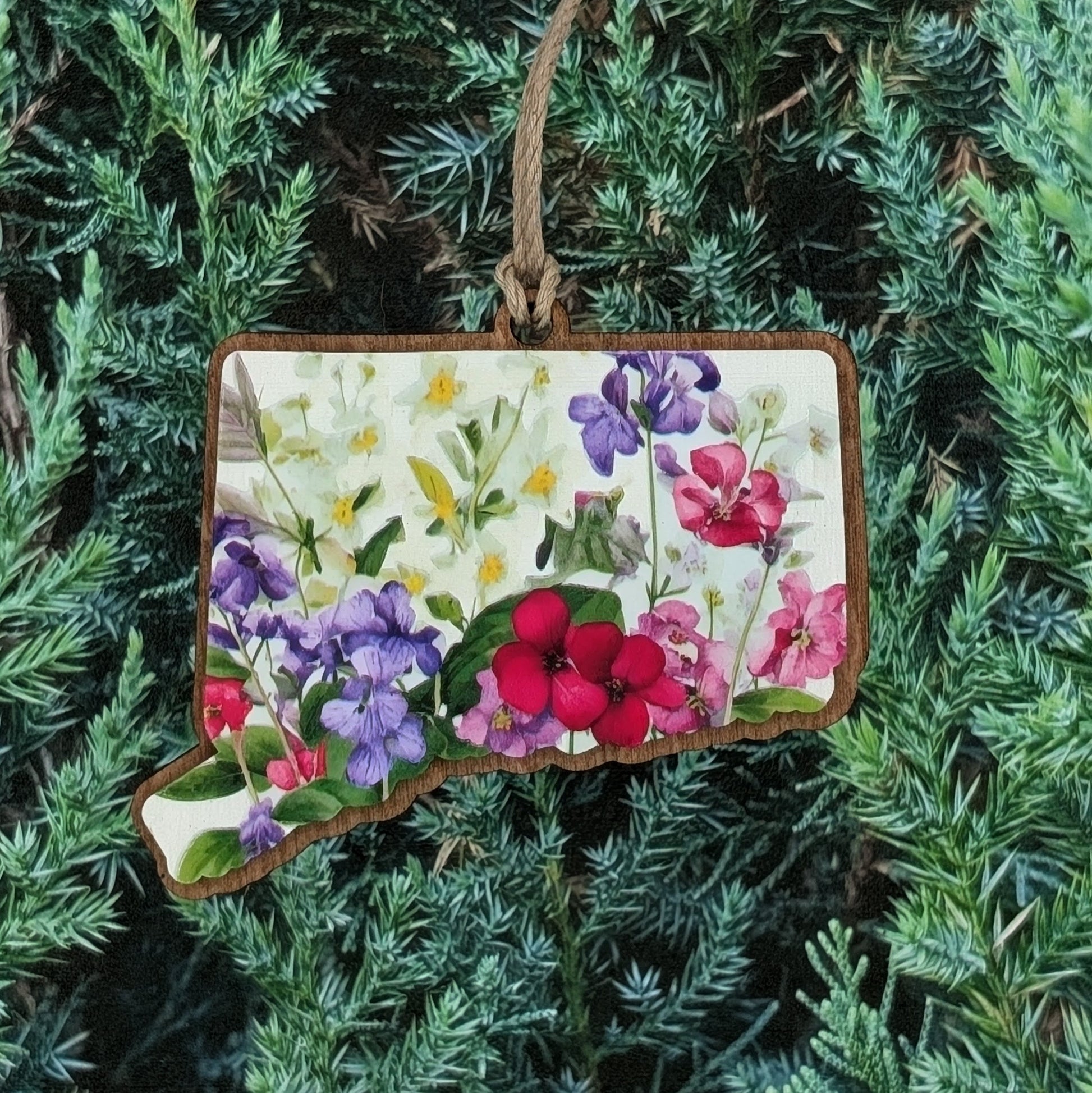 Celebrate the natural beauty of the Constitution State with this Connecticut-shaped ornament featuring a vibrant wildflower design. Bright blooms in pink, purple, and yellow capture the charm of a New England spring. Each ornament is UV printed on wood for a crisp, lasting finish and comes ready to hang with a natural twine cord. Perfect for garden lovers, nature enthusiasts, or anyone proud to call Connecticut home.
