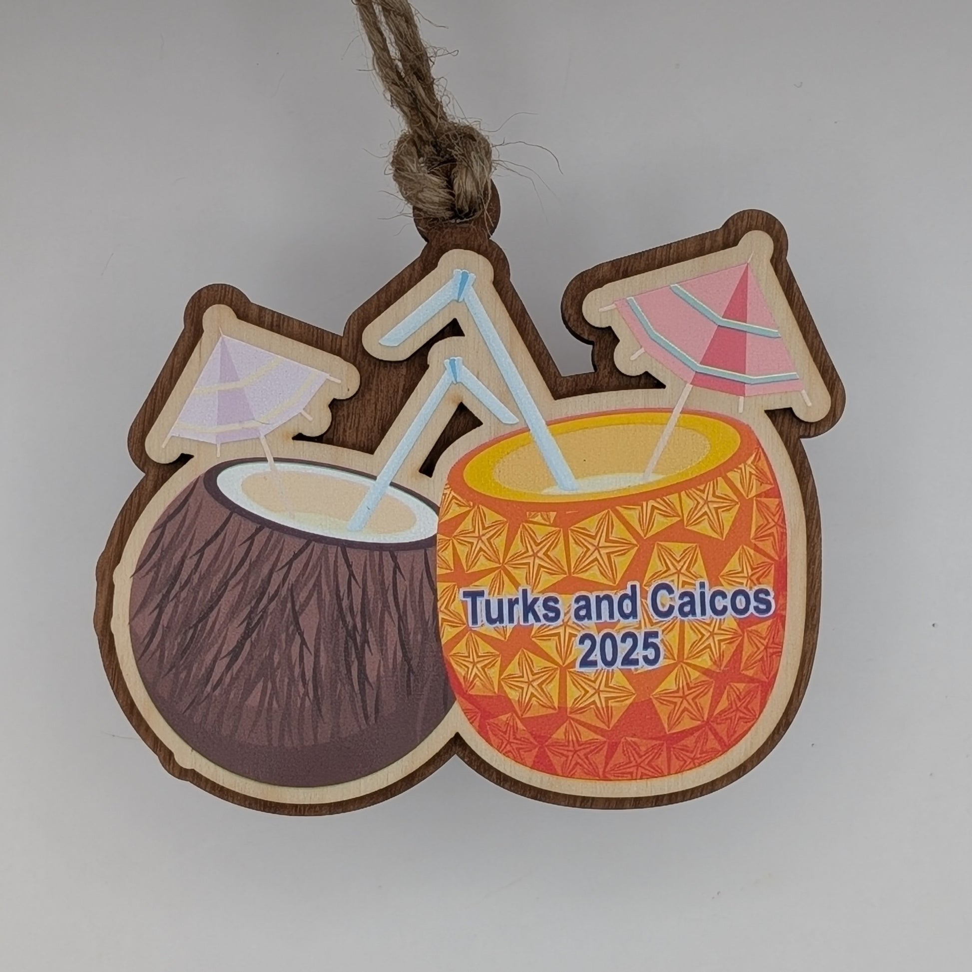Bring the beach to your holiday tree with this vibrant tropical drink ornament, featuring two tropical drinks—one in a coconut and the other in a carved pineapple—topped with cheerful umbrellas and playful straws. UV-printed on natural wood, it’s a sunny keepsake that captures the carefree spirit of island life.